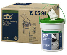 Gebruiksaanwijzing: Neem een Tork Wet Wipe uit de emmer en reinig het gewenste oppervlak. Sluit de emmer na gebruik goed om uitdroging van de doekjes te voorkomen. Doekjes na gebruik weggooien.